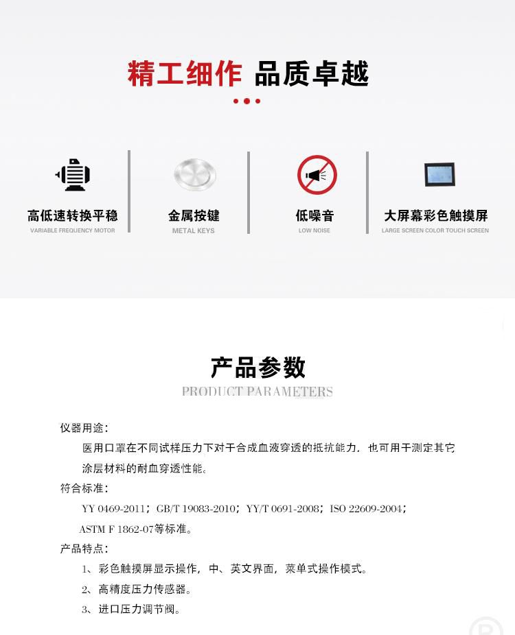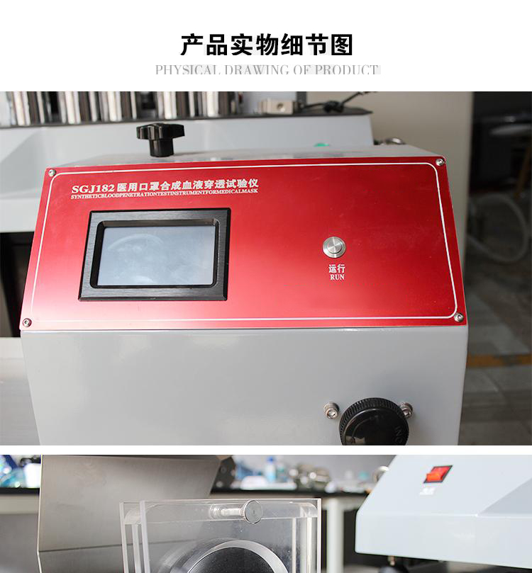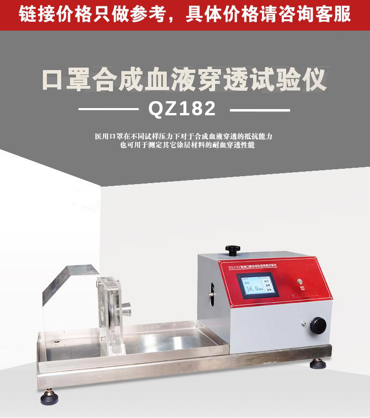医用口罩在不同试样压力下对于合成血液穿透的抵抗能力,也可用于测定其它涂层材料的耐血穿透性能。